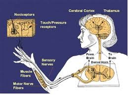 Il existe au niveau de la peau, des muscles, des articulations, des récepteurs à la douleur, les nocicepteurs, qui sont chargés de véhiculer par voie nerveuse l’information sensorielle jusqu’à l’encéphale, qui déclenchera la réponse adaptée. Un exemple simple : le fait de retirer immédiatement sa main quand elle rentre inopinément en contact avec une source de chaleur passe par ce mécanisme nociceptif d’arc réflexe. Mais, selon la théorie du portillon, il faut que la stimulation (le stimulus) dépasse un certain seuil pour déclencher une réponse électrique.