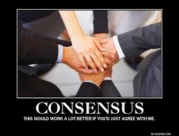 - Consensus: position moyenne acceptable par toutes les parties. Adjectif : consensuel(le). Le consensus est souvent qualifié de « mou », surtout par ceux qui préfèrent l’affrontement à l’apaisement.