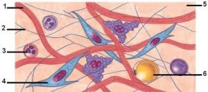 Dernier élément constitutif du conjonctif, les fibres, qui sont de trois types : le collagène, inélastique et offrant une grande résistance ; la réticuline, inextensible et souple, enfin l’élastine, souple et extensible. Grâce à ces fibres, le conjonctif est à la fois souple, élastique et très résistant. En volume, c’est le collagène qui est le principal constituant du tissu conjonctif. On devrait en fait dire les collagènes, tant sont nombreuses les variétés de collagène.